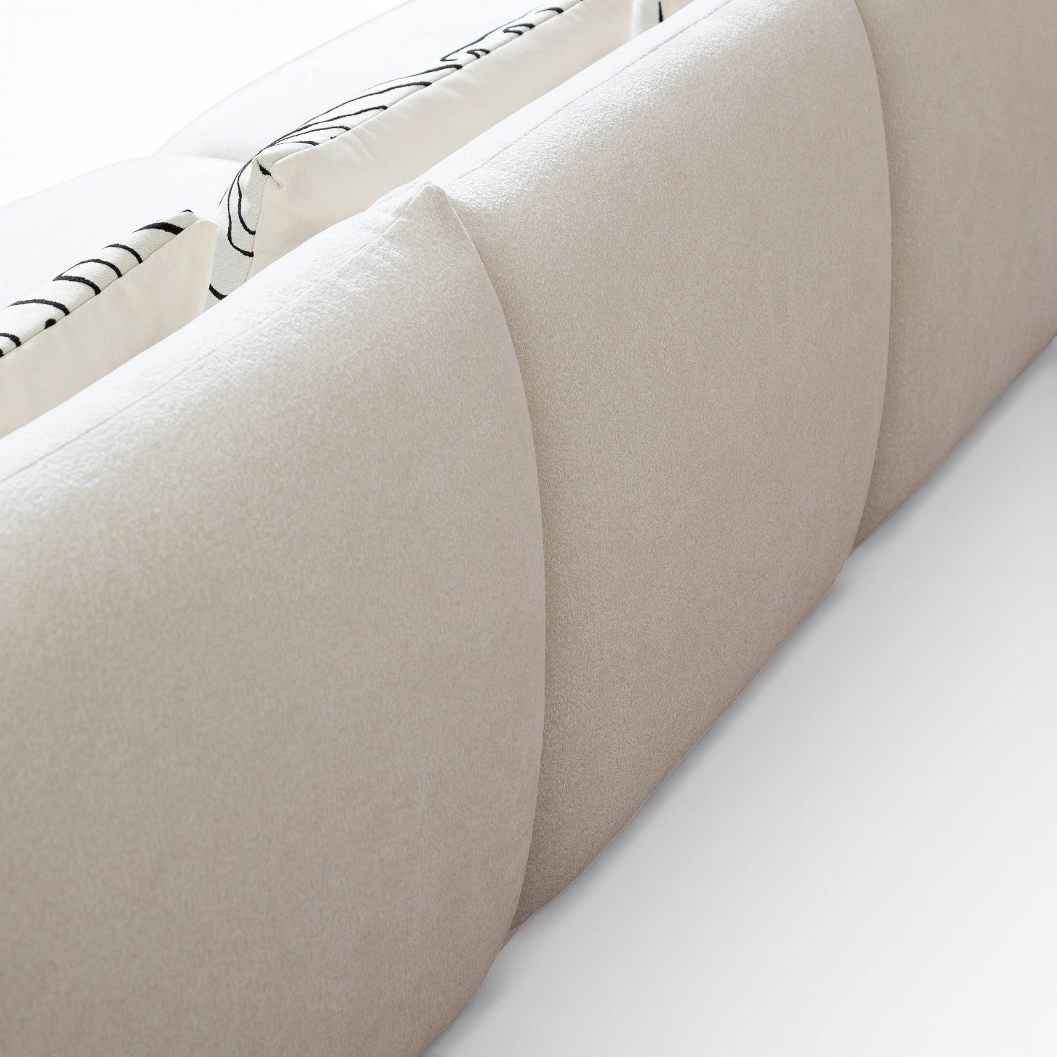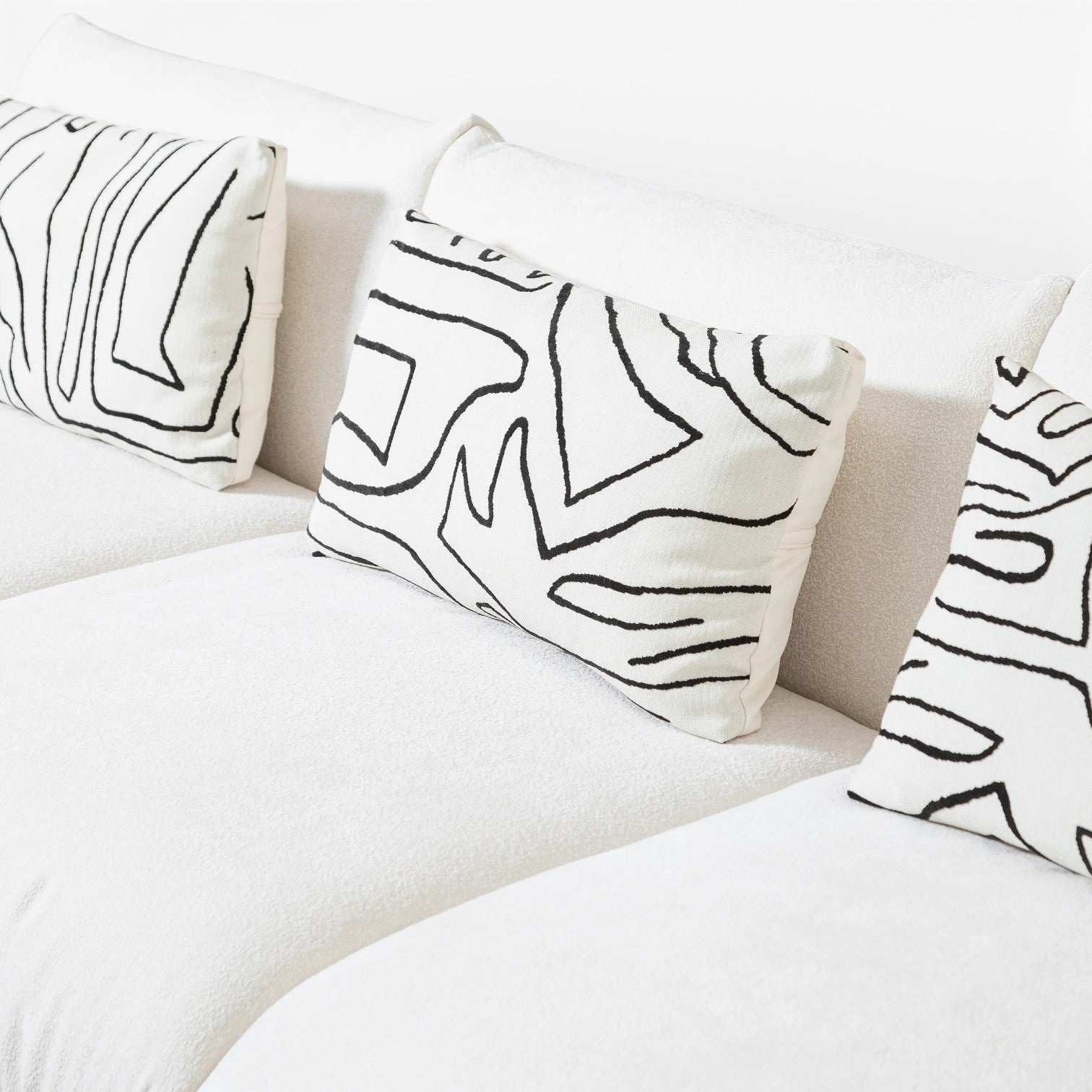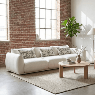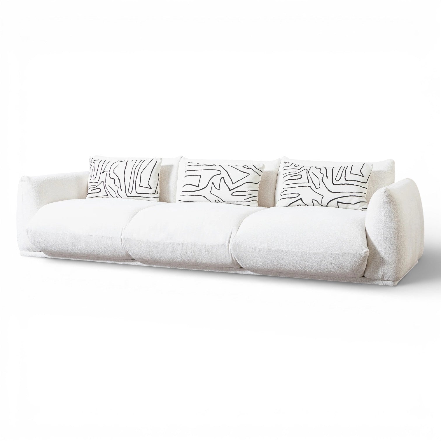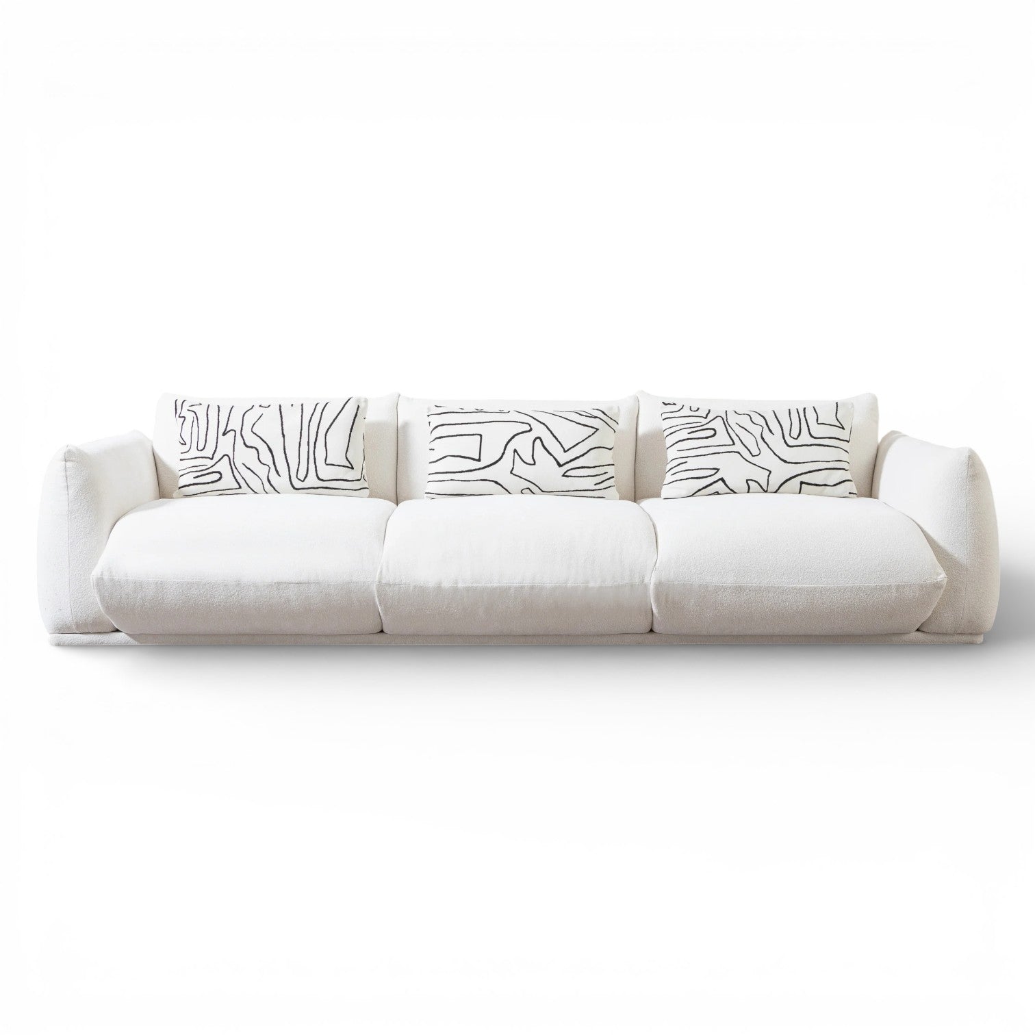 Abstract accent pillows add a modern edge, elevating the sofa’s minimalist palette with subtle contrast and visual interest.