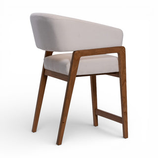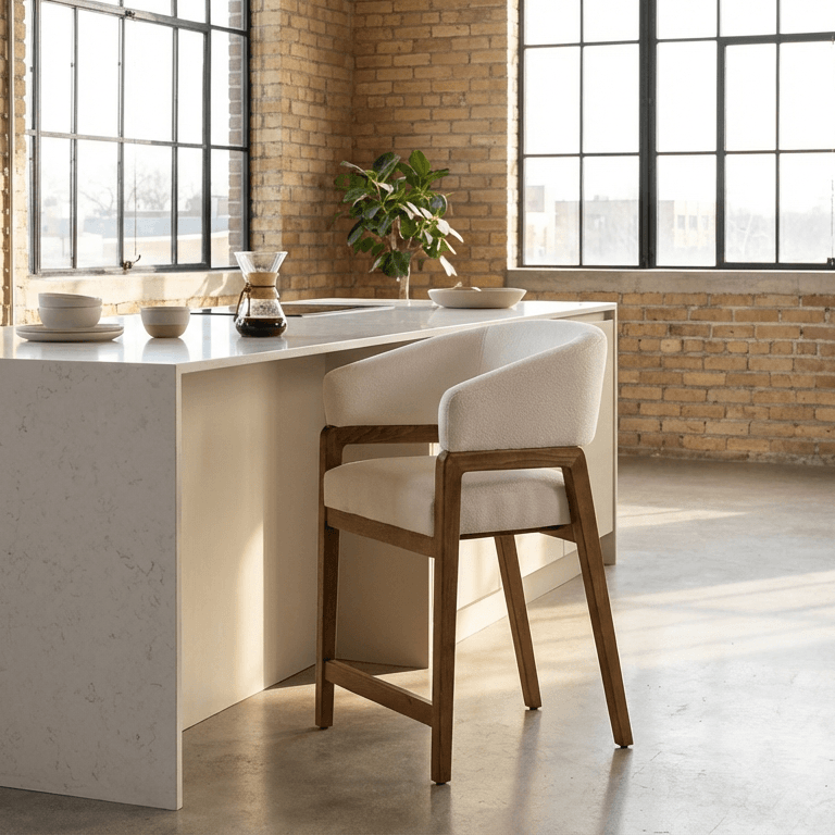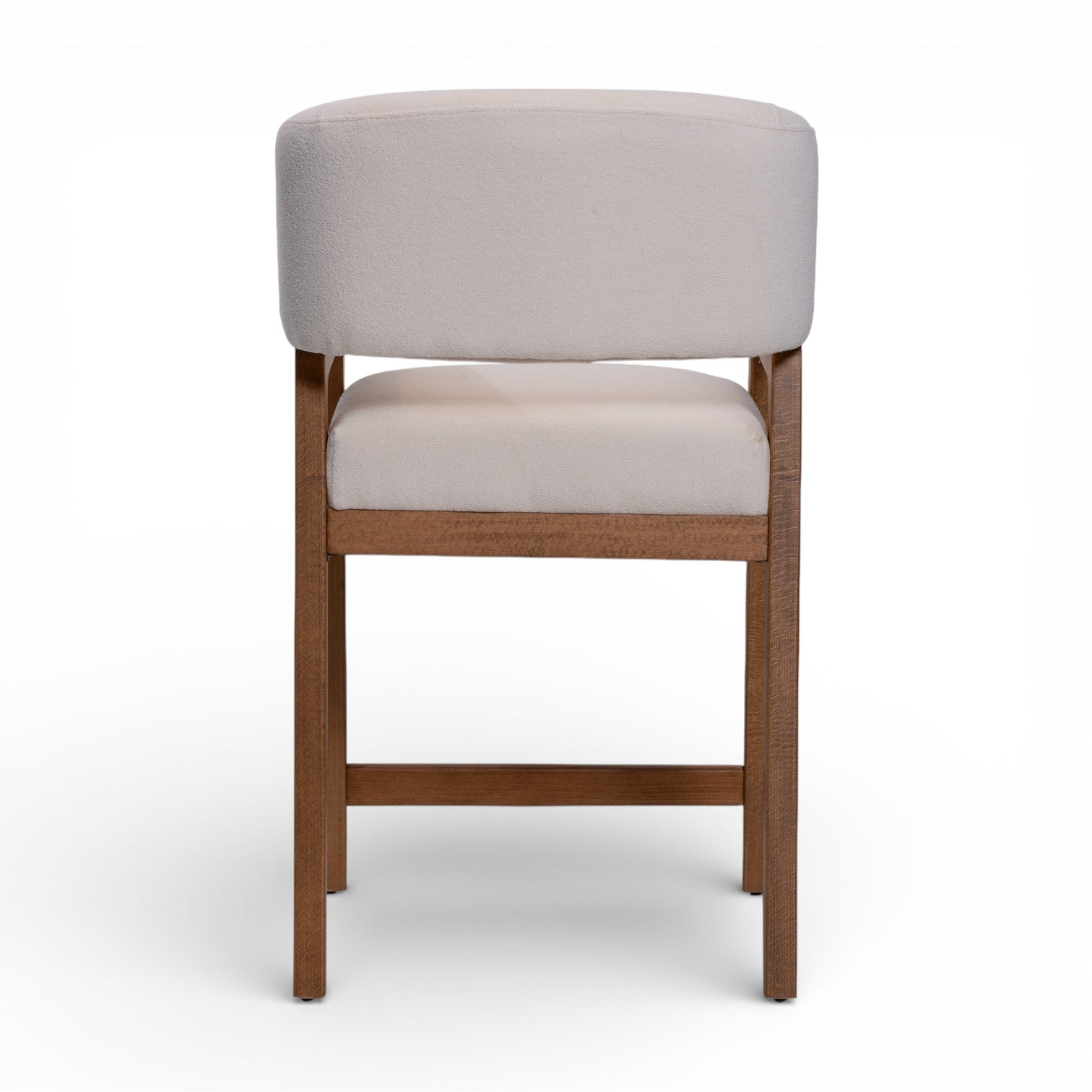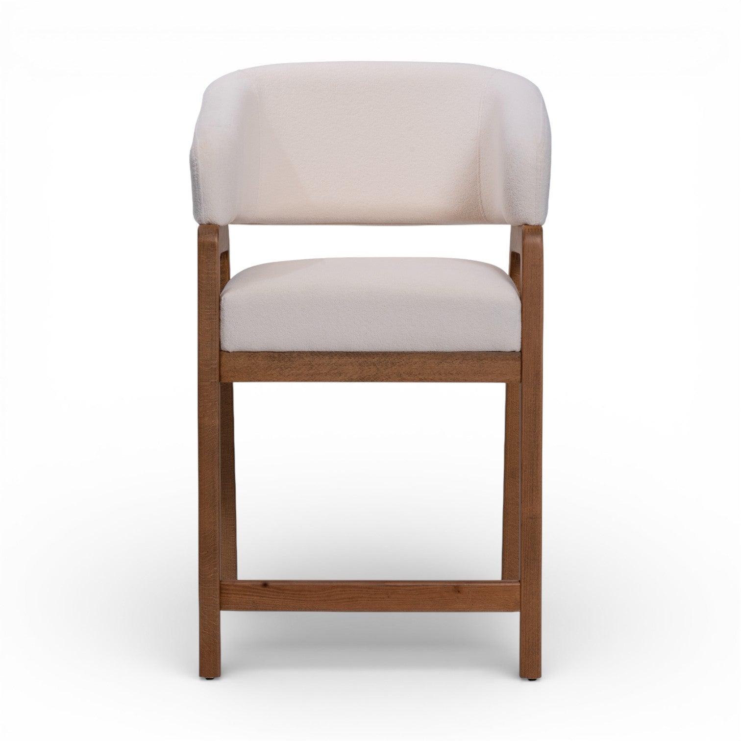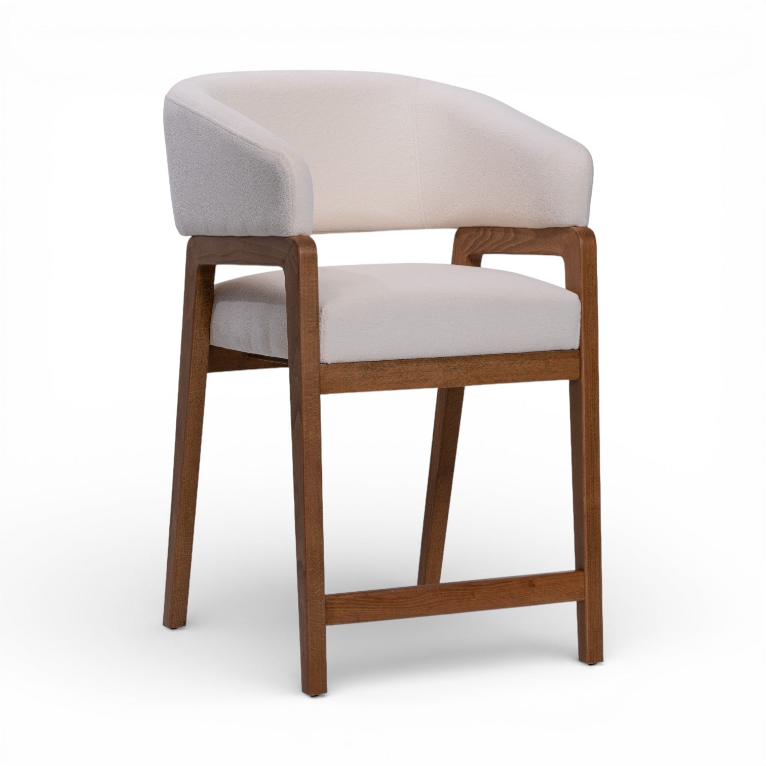 The Enzo counterstool boasts sculptural elegance with its redefined barrel-style seat, soft upholstered curves, and A-frame legs. Its modern detailing and open back create a striking balance of sophistication and playful charm, making it a standout addition to any space.