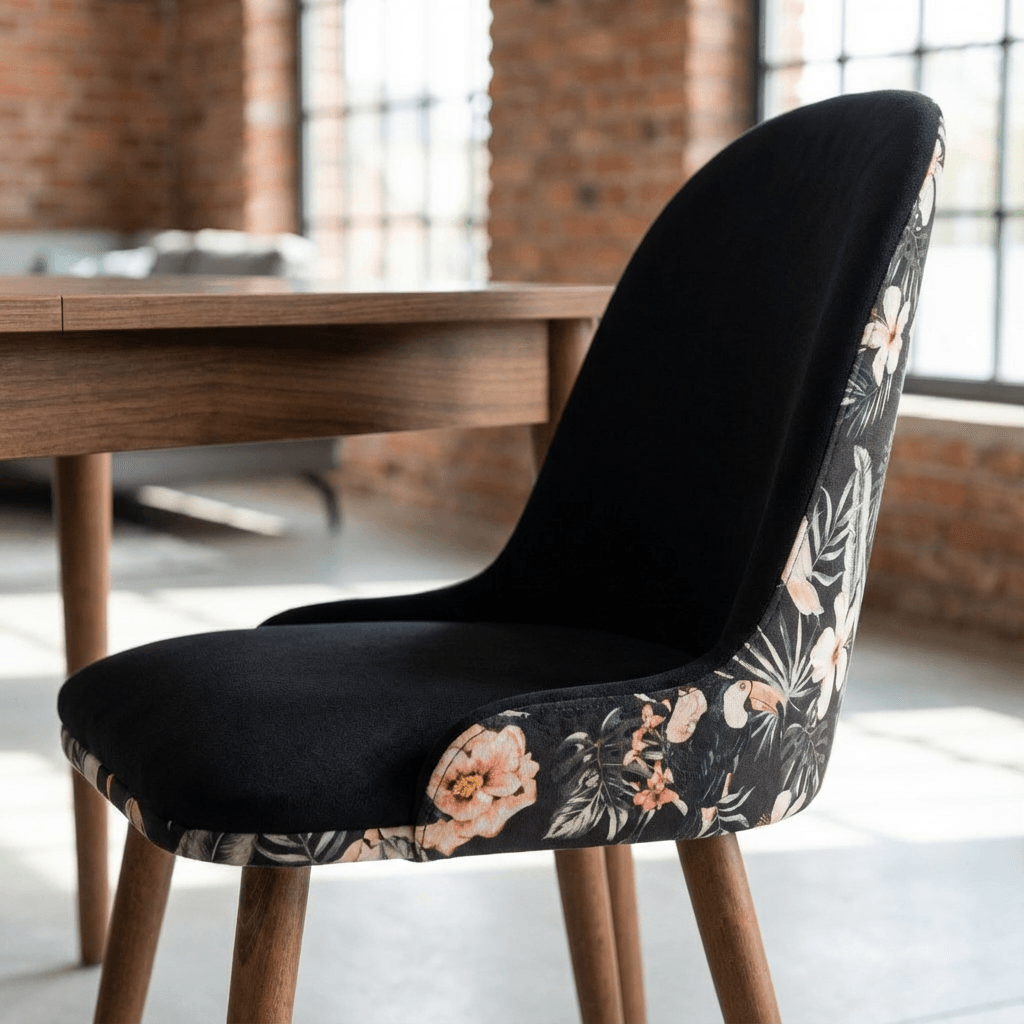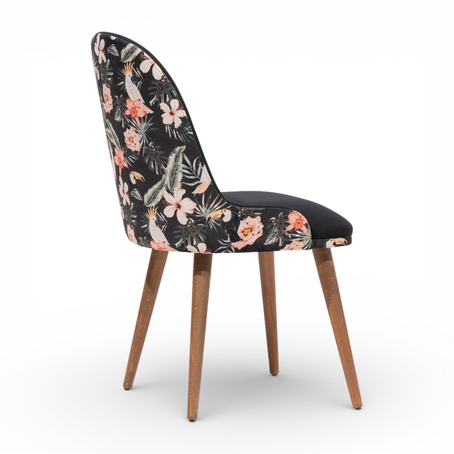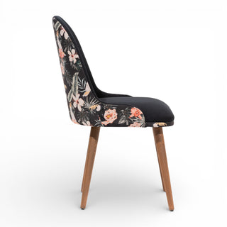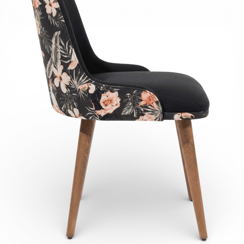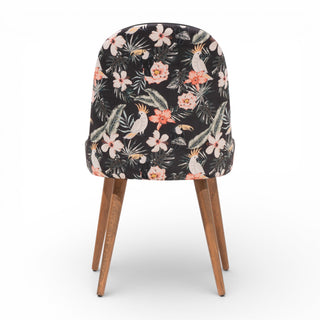 Eye-catching tropical fabric wraps the back and sides, paired with a sleek black seat for striking contrast.