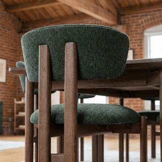 The Segura Dining Chair features an eye-catching exposed wood design at the back, adding a touch of natural elegance to its timeless and sophisticated style.